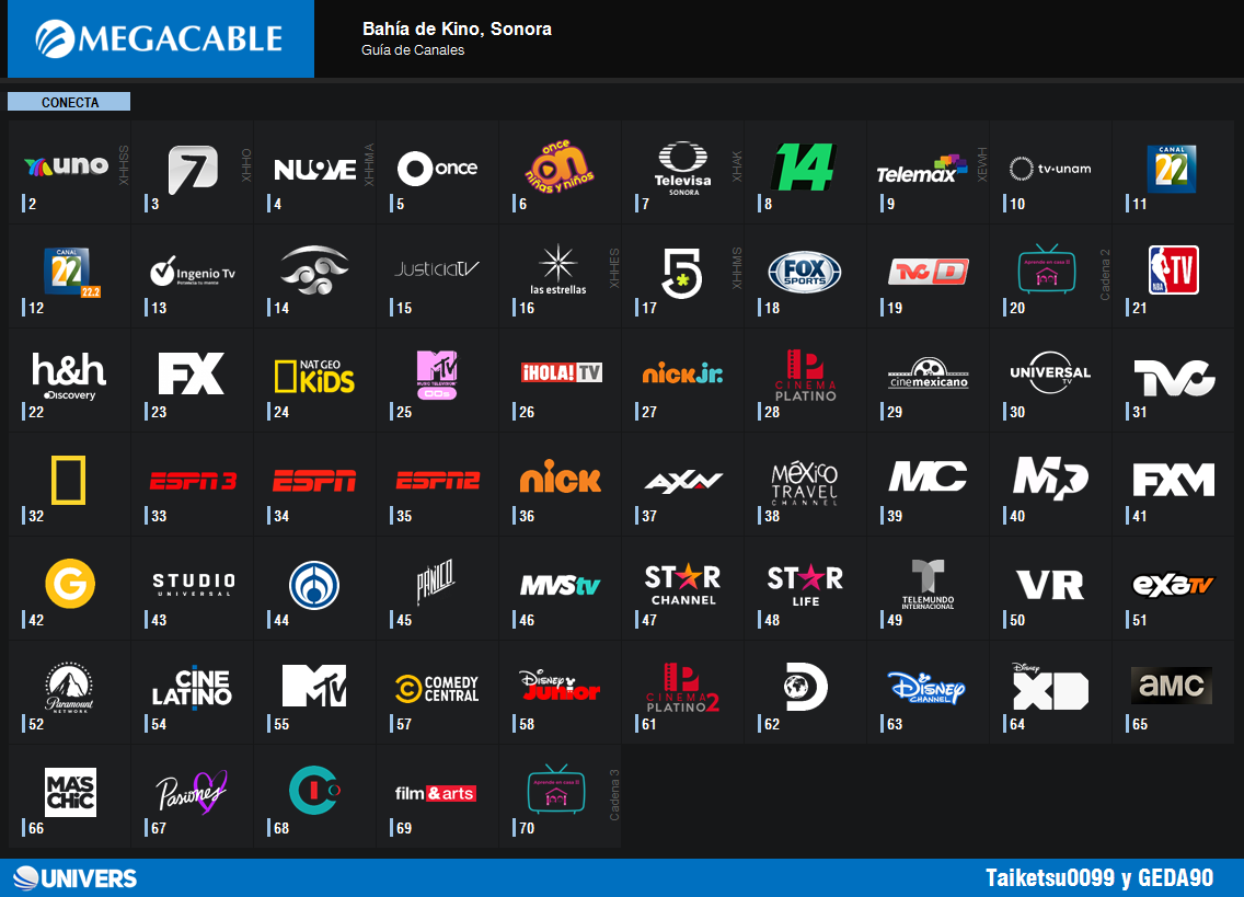 Megacable Bahía de Kino, Sonora 2 - Azteca Uno 3 - Azteca 7 4 - NU9VE 5 - Once TV 6 - Once Niñas y Niños 7 - Televisa Sonora 8 - Canal Catorce 9 - Telemax 10 - TV UNAM 11 - Canal 22 12 - Canal 22.2 13 - Ingenio TV 14 - Canal del Congreso 15 - Justicia TV 16 - Las Estrellas 17 - Canal 5 18 - Fox Sports 19 - TVC Deportes 20 - Mega Sports 21 - NBA TV 22 - Discovery Home & Health 23 - FX 24 - Nat Geo Kids 25 - MTV 00s 26 - ¡Hola! TV 27 - Nick Jr. 28 - Cinema Platino 29 - Cine Mexicano 30 - Universal TV 31 - Meganoticias MX 32 - National Geographic 33 - ESPN 3 34 - ESPN 35 - ESPN 2 36 - Nick 37 -AXN 38 - México Travel Channel 39 - Multicinema 40 - Multi Premier 41 - FXM 42 - El Gourmet 43 - Studio Universal 44 - Tele Fórmula 45 - Panico 46 - MVS TV 47 - Star Channel 48 - Star Life 49 - Telemundo Internacional 50 - VR 51 - Exa TV 52 - Paramount Network 53 - TV CORTOS 54 - Cine Latino 55 - MTV 56 - MTV 80s 57 - Comedy Central 58 - Disney Junior 59 - Europa Europa 60 - Trace Sports 61 - Cinema Platino 2 62 - Discovery 63 - Disney Channel 64 - Disney XD 65 - AMC 66 - MásChic 67 - Pasiones 68 - I.SAT 69 - Film & Arts 70 - TVC Deportes 2