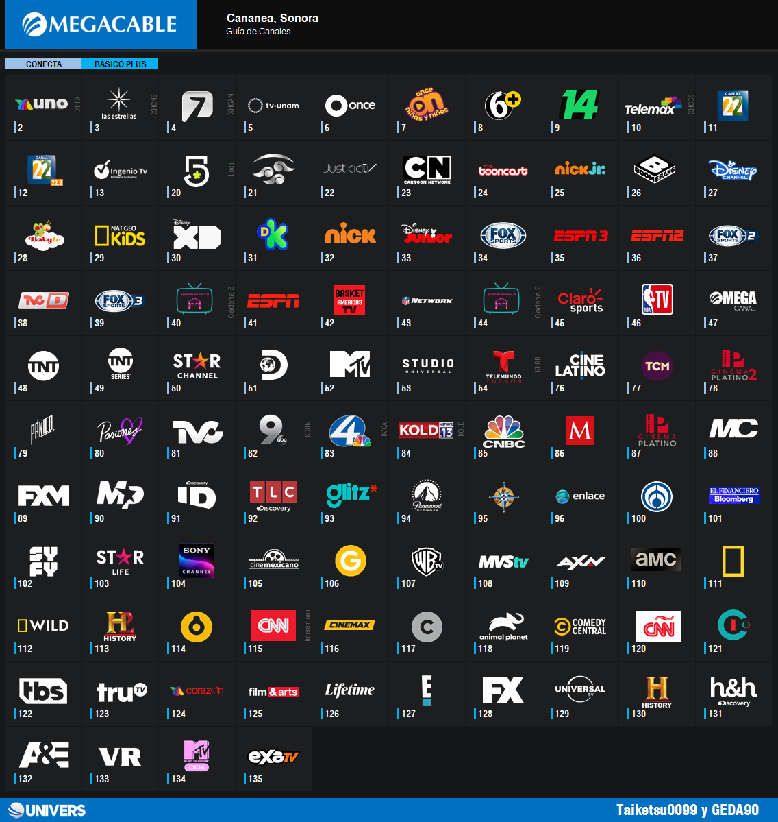 Megacable Cananea, Sonora 2 - Azteca Uno 3 - Las Estrellas 4 - Azteca 7 5 - TV UNAM 6 - Once TV 7 - Once Niñas y Niños 8 - Multimedios Plus 9 - Canal Catorce 10 - Telemax 11 - Canal 22 12 - Canal 22.2 13 - Ingenio TV 20 - Canal 5 Local 21 - Canal del Congreso 22 - Justicia TV 23 - Cartoon Network 24 - Tooncast 25 - Nick Jr. 26 - Cartoonito 27 - Disney Channel 28 - Baby TV 29 - Nat Geo Kids 30 - Disney XD 31 - Discovery Kids 32 - Nick 33 - Disney Junior 34 - Fox Sports 35 - ESPN 3 36 - ESPN 2 37 - Fox Sports 2 38 - TVC Deportes 39 - Fox Sports 3 40 - TVC Deportes 2 41 - ESPN 42 - Basket Americas TV 43 - NFL Network 44 - Mega Sports 45 - Claro Sports 46 - NBA TV 47 - Meganoticias 48 - TNT 49 - TNT Series 50 - Star Channel 51 - Discovery 52 - MTV 53 - Studio Universal 54 - Telemundo Tucson 55 - HBO 56 - HBO 2 57 - HBO Signature 58 - HBO Plus 59 - HBO Family 60 - HBO Mundi 61 - HBO Pop 62 - HBO Xtreme 69 - Star Hits 70 - Star Action 71 - Star Comedy 72 - Star Cinema 73 - Star Fun 74 - Star Classics 75 - Star Series 76 - Cine Latino 77 - TCM 78 - Cinema Platino 2 79 - Panico 80 - Pasiones 81 - Meganoticias MX 82 - Channel 9 ABC Tucson 83 - Channel 4 NBC Tucson 84 - KOLD NEWS 13 85 - CNBC 86 - Milenio Televisión 87 - Cinema Platino 88 - Multicinema 89 - FXM 90 - Multi Premier 91 - Discovery ID 92 - TLC 93 - Glitz* 94 - Paramount Network 95 - María Visión 96 - Enlace TBN 99 - BBC World News 100 - Tele Fórmula 101 - El Financiero Bloomberg 102 - Syfy 103 - Star Life 104 - Sony 105 - Cine Mexicano 106 - El Gourmet 107 - Warner TV 108 - MVS TV 109 - AXN 110 - AMC 111 - National Geographic 112 - National Geographic Wild 113 - History 2 114 - Space 115 - CNN International 116 - Cinemax 117 - Cinecanal 118 - Animal Planet 119 - Comedy Central 120 - CNN En Español 121 - I.SAT 122 - TBS 123 - Tru TV 124 - Az Corazón 125 - Film & Arts 126 - Lifetime 127 - E! Entertainment 128 - FX 129 - Universal TV 130 - History 131 - Discovery Home & Health 132 - A&E 133 - VR 134 - MTV 00s 135 - Exa TV