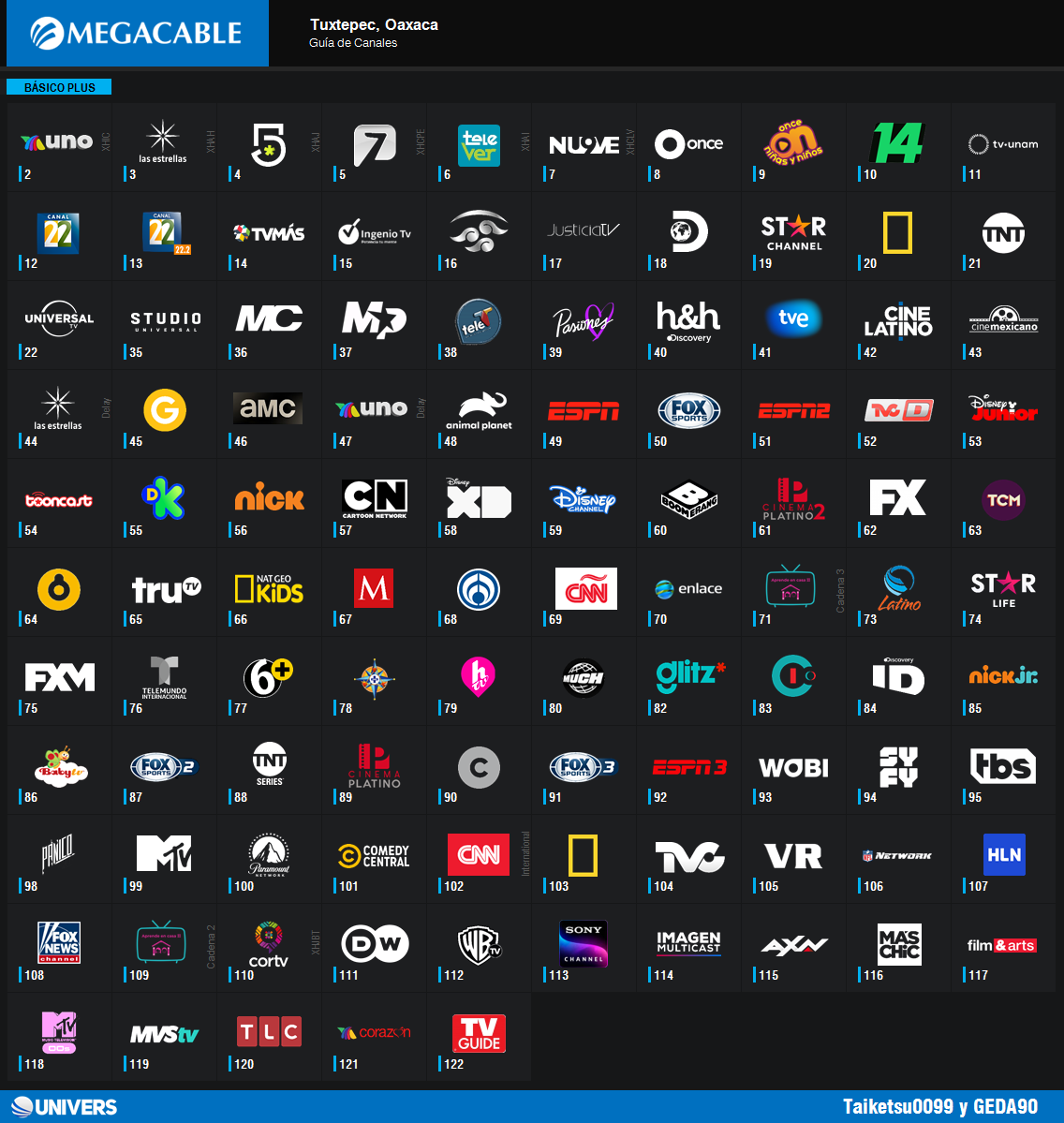 Megacable Tuxtepec, Oaxaca 2 - Azteca Uno 3 - Las Estrellas 4 - Canal 5 5 - Azteca 7 6 - Tele Ver 7 - NU9VE 8 - Once TV 9 - Once Niñas y Niños 10 - Canal Catorce 11 - TV UNAM 12 - Canal 22 13 - Canal 22.2 14 - TVMÁS 15 - Ingenio TV 16 - Canal del Congreso 17 - Justicia TV 18 - Discovery 19 - Star Channel 20 - National Geographic 21 - TNT 22 - Universal TV 23 - HBO 24 - HBO 2 25 - HBO Signature 26 - HBO Family 27 - HBO Plus 28 - HBO Mundi 29 - HBO Xtreme 30 - Star Cinema 31 - Star Action 32 - Star Hits 33 - Star Fun 34 - Star Classics 35 - Studio Universal 36 - Multicinema 37 - Multi Premier 38 - Tele T 39 - Pasiones 40 - Discovery Home & Health 41 - TVE Internacional 42 - Cine Latino 43 - Cine Mexicano 44 - Las Estrellas Delay 45 - El Gourmet 46 - AMC 47 - Azteca Uno Delay 48 - Animal Planet 49 - ESPN 50 - Fox Sports 51 - ESPN 2 52 - TVC Deportes 53 - Disney Junior 54 - Tooncast 55 - Discovery Kids 56 - Nick 57 - Cartoon Network 58 - Disney XD 59 - Disney Channel 60 - Cartoonito 61 - Cinema Platino 2 62 - FX 63 - TCM 64 - Space 65 - Tru TV 66 - Nat Geo Kids 67 - Milenio Televisión 68 - Tele Fórmula 69 - CNN En Español 70 - Enlace TBN 71 - TVC Deportes 2 72 - Az Cinema 73 - 3ABN Latino 74 - Star Life 75 - FXM 76 - Telemundo Internacional 77 - Multimedios Plus 78 - María Visión 79 - HTV 80 - Much Music 81 - MTV 80s 82 - Glitz* 83 - I.SAT 84 - Discovery ID 85 - Nick Jr. 86 - Baby TV 87 - Fox Sports 2 88 - TNT Series 89 - Cinema Platino 90 - Cinecanal 91 - Fox Sports 3 92 - ESPN 3 93 - WOBI 94 - Syfy 95 - TBS 96 - Az Mundo 97 - Europa Europa 98 - Panico 99 - MTV 100 - Paramount Network 101 - Comedy Central 102 - CNN International 103 - National Geographic Delay 104 - Meganoticias MX 105 - VR 106 - NFL Network 107 - HLN 108 - Fox News 109 - Mega Sports 110 - CORTV 111 - DW 112 - Warner TV 113 - Sony 114 - Imagen Multicast 115 - AXN 116 - MásChic 117 - Film & Arts 118 - MTV 00s 119 - MVS TV 120 - TLC 121 - Az Corazón 122 - TV Guide