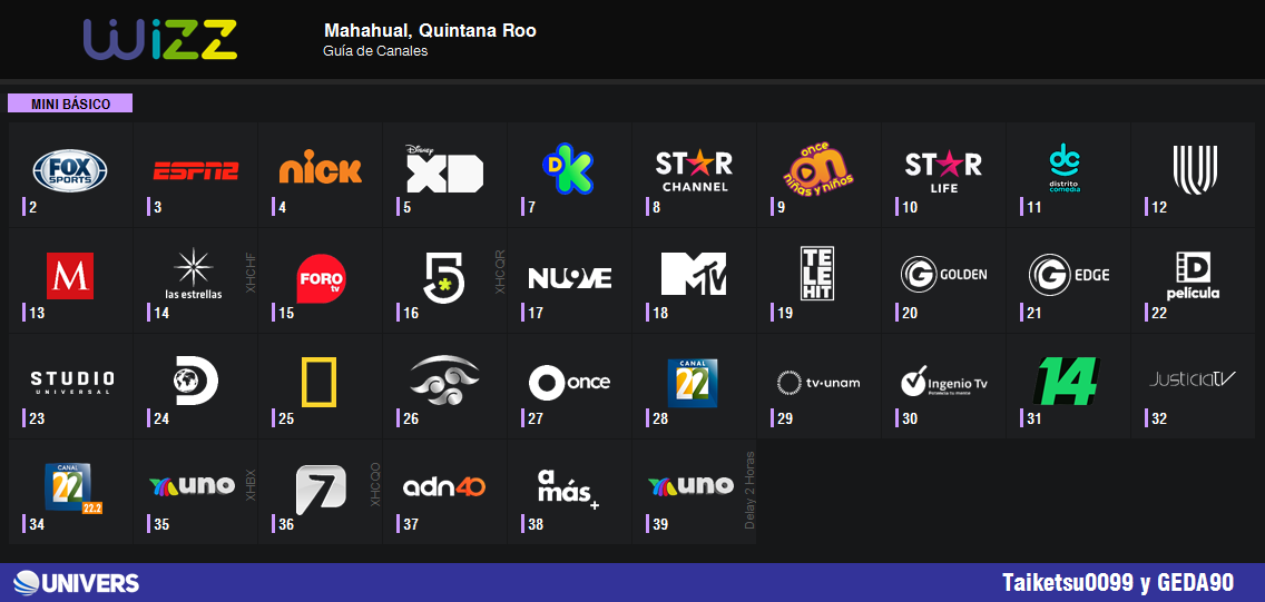 WIZZ Mahahual, Quintana Roo 2 - Fox Sports 3 - ESPN 2 4 - Nick 5 - Disney XD 6 - María Visión 7 - Discovery Kids 8 - Star Channel 9 - Once Niñas y Niños 10 - Star Life 11 - Distrito Comedia 12 - Unicable 13 - Milenio Televisión 14 - Las Estrellas 15 - Foro TV 16 - Canal 5 17 - NU9VE 18 - MTV 19 - Telehit 20 - Golden 21 - Golden Edge 22 - De Película 23 - Studio Universal 24 - Discovery 25 - National Geographic 26 - Canal del Congreso 27 - Once TV 28 - Canal 22 29 - TV UNAM 30 - Ingenio TV 31 - Canal Catorce 32 - Justicia TV 33 - Canal 13 Quintana Roo 34 - Canal 22.2 35 - Azteca Uno 36 - Azteca 7 37 - ADN 40 38 - a más+ 39 - Azteca Uno Delay 2 Horas