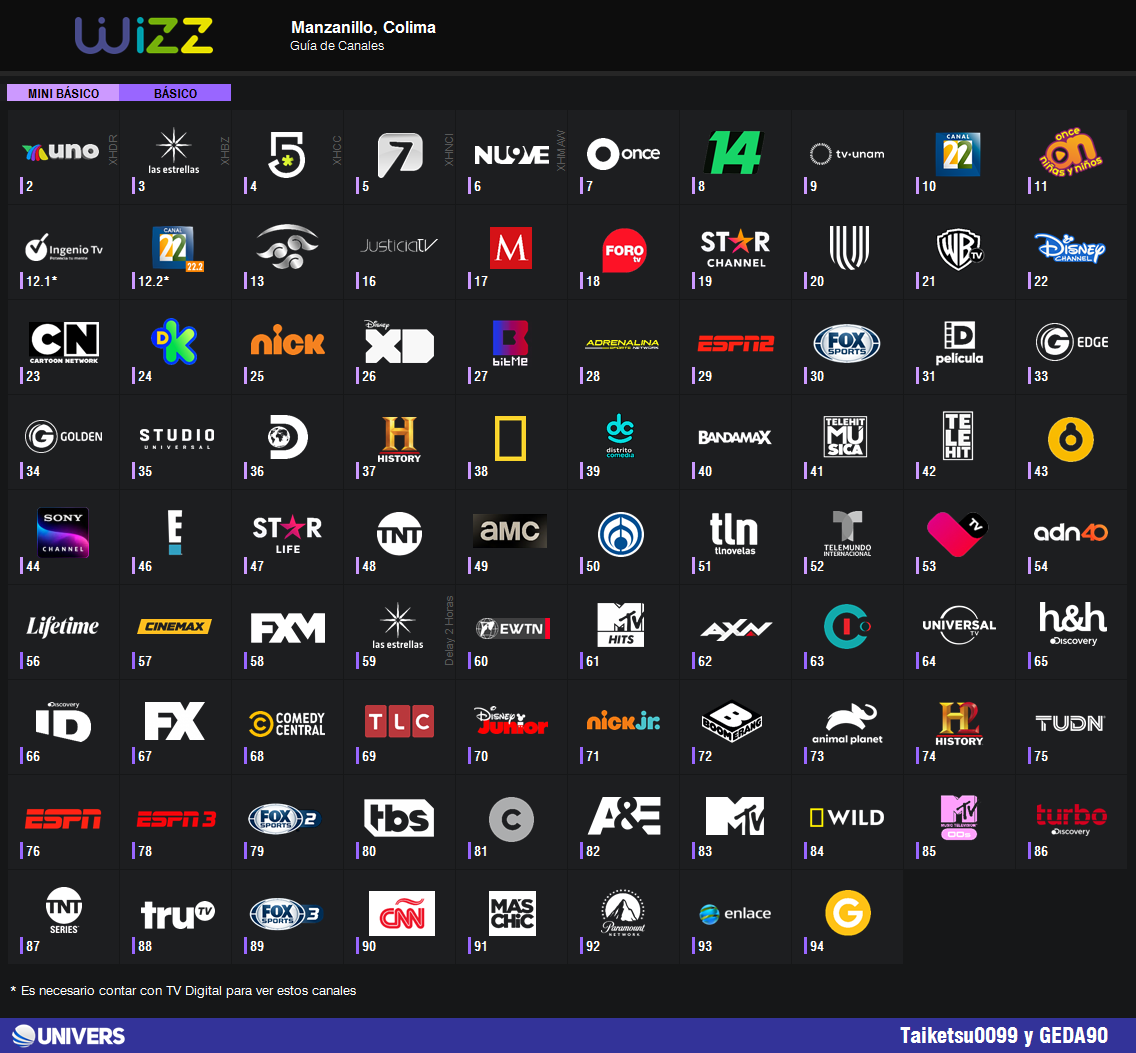 WIZZ Manzanillo, Colima 2 - Azteca Uno 3 - Las Estrellas 4 - Canal 5 5 - Azteca 7 6 - NU9VE 7 - Once TV 8 - Canal Catorce 9 - TV UNAM 10 - Canal 22 11 - Once Niñas y Niños 12.1 - Ingenio TV 12.2 - Canal 22.2 13 - Canal del Congreso 16 - Justicia TV 17 - Milenio Televisión 18 - Foro TV 19 - Star Channel 20 - Unicable 21 - Warner TV 22 - Disney Channel 23 - Cartoon Network 24 - Discovery Kids 25 - Nick 26 - Disney XD 27 - bitMe 28 - Adrenalina Sports Network 29 - ESPN 2 30 - Fox Sports 31 - De Película 32 - TCM 33 - Golden Edge 34 - Golden 35 - Studio Universal 36 - Discovery 37 - History 38 - National Geographic 39 - Distrito Comedia 40 - Bandamax 41 - Telehit Música 42 - Telehit 43 - Space 44 - Sony 45 - María Visión 46 - E! Entertainment 47 - Star Life 48 - TNT 49 - AMC 50 - Tele Fórmula 51 - TL Novelas 52 - Telemundo Internacional 53 - Quiero TV 54 - ADN 40 55 - TVE Internacional 56 - Lifetime 57 - Cinemax 58 - FXM 59 - Las Estrellas Delay 2 Horas 60 - EWTN 61 - MTV Hits 62 - AXN 63 - I.SAT 64 - Universal TV 65 - Discovery Home & Health 66 - Discovery ID 67 - FX 68 - Comedy Central 69 - TLC 70 - Disney Junior 71 - Nick Jr. 72 - Cartoonito 73 - Animal Planet 74 - History 2 75 - TUDN 76 - ESPN 77 - ESPN EXTRA 78 - ESPN 3 79 - Fox Sports 2 80 - TBS 81 - Cinecanal 82 - A&E 83 - MTV 84 - National Geographic Wild 85 - MTV 00s 86 - Discovery Turbo 87 - TNT Series 88 - Tru TV 89 - Fox Sports 3 90 - CNN En Español 91 - MásChic 92 - Paramount Network 93 - Enlace TBN 94 - El Gourmet