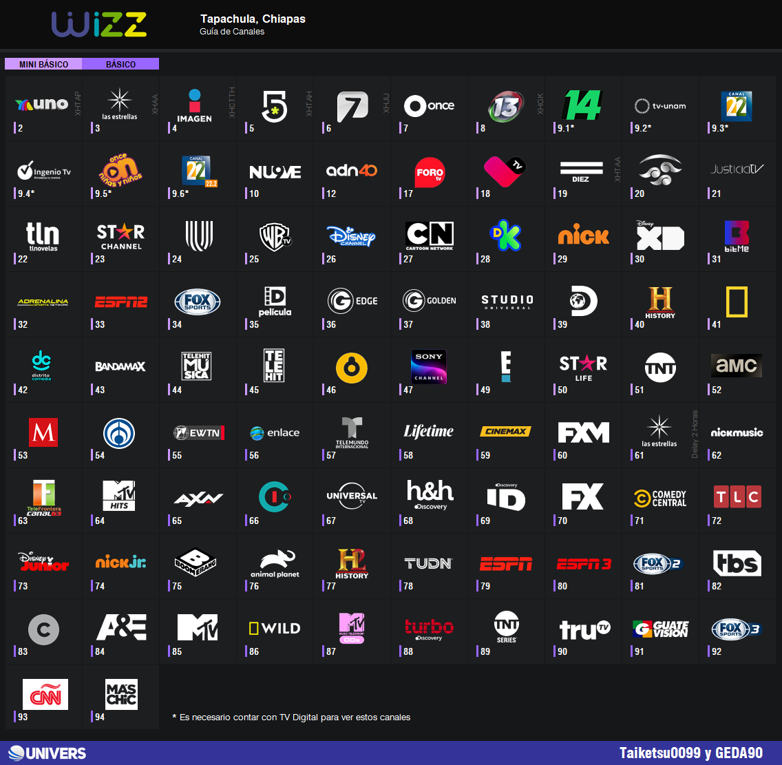 WIZZ Tapachula, Chiapas 2 - Azteca Uno 3 - Las Estrellas 4 - Imagen Televisión 5 - Canal 5 6 - Azteca 7 7 - Once TV 8 - Canal 13 Tapachula 9.1 - Canal Catorce 9.2 - TV UNAM 9.3 - Canal 22 9.4 - Ingenio TV 9.5 - Once Niñas y Niños 9.6 - Canal 22.2 10 - NU9VE 12 - ADN 40 17 - Foro TV 18 - Quiero TV 19 - Canal 10 de la Costa (Canal Diez Chiapas) 20 - Canal del Congreso 21 - Justicia TV 22 - TL Novelas 23 - Star Channel 24 - Unicable 25 - Warner TV 26 - Disney Channel 27 - Cartoon Network 28 - Discovery Kids 29 - Nick 30 - Disney XD 31 - bitMe 32 - Adrenalina Sports Network 33 - ESPN 2 34 - Fox Sports 35 - De Película 36 - Golden Edge 37 - Golden 38 - Studio Universal 39 - Discovery 40 - History 41 - National Geographic 42 - Distrito Comedia 43 - Bandamax 44 - Telehit Música 45 - Telehit 46 - Space 47 - Sony 48 - María Visión 49 - E! Entertainment 50 - Star Life 51 - TNT 52 - AMC 53 - Milenio Televisión 54 - Tele Fórmula 55 - EWTN 56 - Enlace TBN 57 - Telemundo Internacional 58 - Lifetime 59 - Cinemax 60 - FXM 61 - Las Estrellas Delay 2 Horas 62 - Nick Music 63 - Telefrontera 64 - MTV Hits 65 - AXN 66 - I.SAT 67 - Universal TV 68 - Discovery Home & Health 69 - Discovery ID 70 - FX 71 - Comedy Central 72 - TLC 73 - Disney Junior 74 - Nick Jr. 75 - Cartoonito 76 - Animal Planet 77 - History 2 78 - TUDN 79 - ESPN 80 - ESPN 3 81 - Fox Sports 2 82 - TBS 83 - Cinecanal 84 - A&E 85 - MTV 86 - National Geographic Wild 87 - MTV 00s 88 - Discovery Turbo 89 - TNT Series 90 - Tru TV 91 - Guatevisión 92 - Fox Sports 3 93 - CNN En Español 94 - MásChic