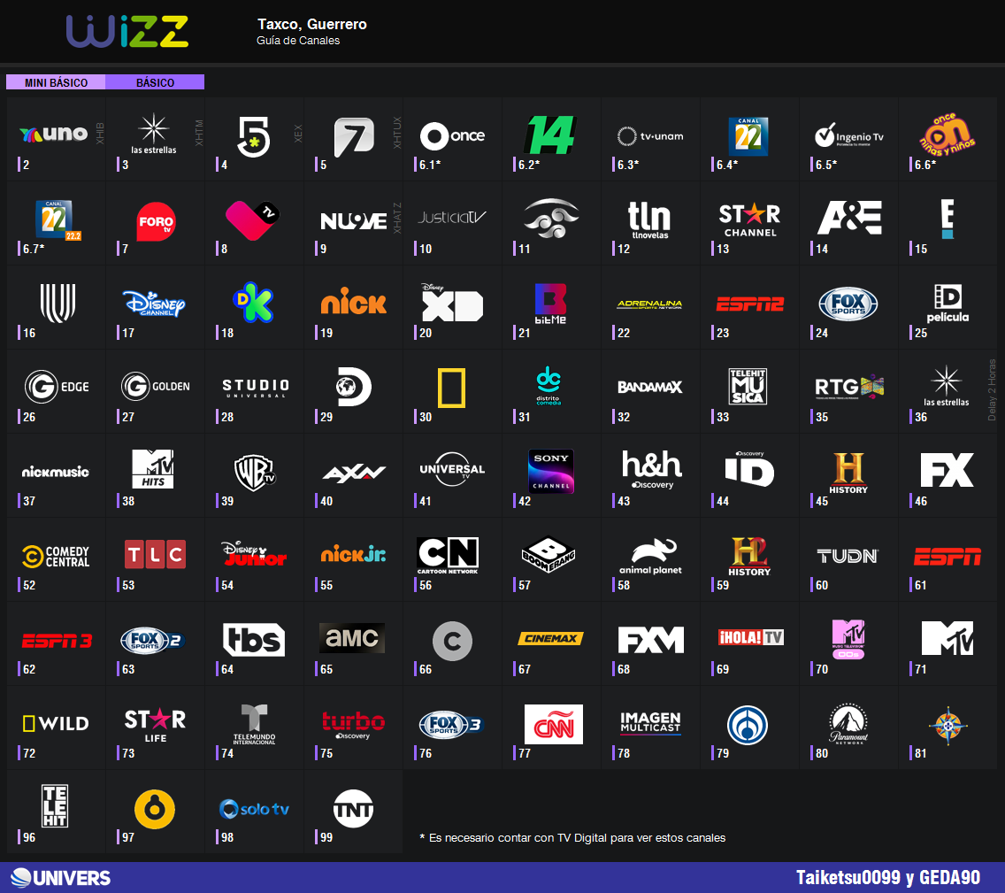 WIZZ Taxco, Guerrero 2 - Azteca Uno 3 - Las Estrellas 4 - Canal 5 5 - Azteca 7 6.1 - Once TV 6.2 - Canal Catorce 6.3 - TV UNAM 6.4 - Canal 22 6.5 - Ingenio TV 6.6 - Once Niñas y Niños 6.7 - Canal 22.2 7 - Foro TV 8 - Quiero TV 9 - NU9VE 10 - Justicia TV 11 - Canal del Congreso 12 - TL Novelas 13 - Star Channel 14 - A&E 15 - E! Entertainment 16 - Unicable 17 - Disney Channel 18 - Discovery Kids 19 - Nick 20 - Disney XD 21 - bitMe 22 - Adrenalina Sports Network 23 - ESPN 2 24 - Fox Sports 25 - De Película 26 - Golden Edge 27 - Golden 28 - Studio Universal 29 - Discovery 30 - National Geographic 31 - Distrito Comedia 32 - Bandamax 33 - Telehit Música 35 - RTG 36 - Las Estrellas Delay 2 Horas 37 - Nick Music 38 - MTV Hits 39 - Warner TV 40 - AXN 41 - Universal TV 42 - Sony 43 - Discovery Home & Health 44 - Discovery ID 45 - History 46 - FX 52 - Comedy Central 53 - TLC 54 - Disney Junior 55 - Nick Jr. 56 - Cartoon Network 57 - Cartoonito 58 - Animal Planet 59 - History 2 60 - TUDN 61 - ESPN 62 - ESPN 3 63 - Fox Sports 2 64 - TBS 65 - AMC 66 - Cinecanal 67 - Cinemax 68 - FXM 69 - ¡Hola! TV 70 - MTV 00s 71 - MTV 72 - National Geographic Wild 73 - Star Life 74 - Telemundo Internacional 75 - Discovery Turbo 76 - Fox Sports 3 77 - CNN En Español 78 - Imagen Multicast 79 - Tele Fórmula 80 - Paramount Network 81 - María Visión 96 - Telehit 97 - Space 98 - Solo TV 99 - TNT