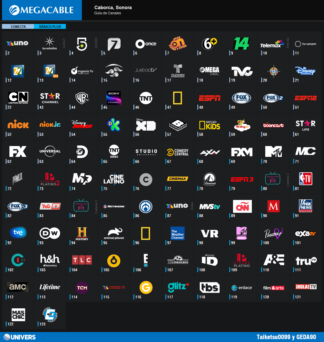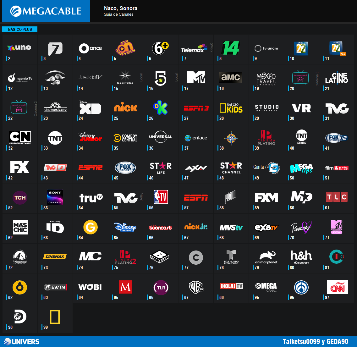Megacable Naco, Sonora - 18 de Agosto de 2021 2 - Azteca Uno 3 - Azteca 7 4 - Once TV 5 - Once Niñas y Niños 6 - Multimedios Plus 7 - Telemax 8 - Canal Catorce 9 - TV UNAM 10 - Canal 22 11 - Canal 22.2 12 - Ingenio TV 13 - Canal del Congreso 14 - Justicia TV 15 - Las Estrellas Local 16 - Canal 5 Local 17 - MTV 18 - AMC 19 - México Travel Channel 20 - TVC Deportes 2 21 - Cine Latino 22 - Mega Sports 23 - Cine Mexicano 24 - Disney XD 25 - Nick 26 - Discovery Kids 27 - ESPN 3 28 - Nat Geo Kids 29 - Studio Universal 30 - VR 31 - Meganoticias MX 32 - Cartoon Network 33 - TNT 34 - Disney Junior 35 - Comedy Central 36 - Universal TV 37 - Enlace TBN 38 - María Visión 39 - Cinema Platino 40 - TNT Series 41 - Fox Sports 2 42 - FX 43 - TVC Deportes 44 - ESPN 2 45 - Fox Sports 46 - Star Life 47 - AXN 48 - Star Channel 49 - AYM Sports 50 - Mega Tips 51 - Film & Arts 52 - TCM 53 - Sony 54 - Tru TV 55 - Meganoticias MX Delay 56 - NBA TV 57 - ESPN 58 - Panico 59 - FXM 60 - Multi Premier 61 - TLC 62 - MásChic 63 - Discovery ID 64 - El Gourmet 65 - Disney Channel 66 - Tooncast 67 - Nick Jr. 68 - MVS TV 69 - Exa TV 70 - Pasiones 71 - MTV 00s 72 - Paramount Network 73 - Cinemax 74 - Multicinema 75 - Cinema Platino 2 76 - Cartoonito 77 - Cinecanal 78 - Telemundo Internacional 79 - Animal Planet 80 - Discovery Home & Health 81 - I.SAT 82 - Space 83 - EWTN 84 - WOBI 85 - Milenio Televisión 86 - Teleritmo 87 - Warner TV 88 - ¡Hola TV! 89 - Star Fun 90 - Imagen Multicast 91 - Fox Sports 3 92 - Euro Channel 93 - Antena 3 94 - A3 Series 95 - Meganoticias 96 - Tele Fórmula 97 - CNN En Español 98 - Discovery 99 - National Geographic