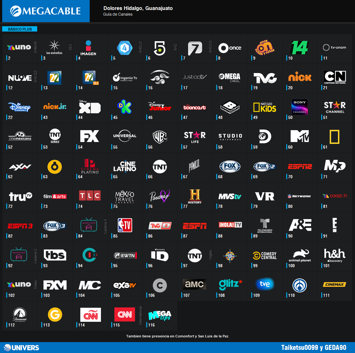 Megacable Dolores Hidalgo, Guanajuato 29 de Agosto de 2021 2 - Azteca Uno 3 - Las Estrellas 4 - Imagen Televisión 5 - TV4 Guanajuato 6 - Canal 5 7 - Azteca 7 8 - Once TV 9 - Once Niñas y Niños 10 - Canal Catorce 11 - TV UNAM 12 - NU9VE 13 - Canal 22 14 - Canal 22.2 15 - Ingenio TV 16 - Canal del Congreso 17 - Justicia TV 18 - Meganoticias 19 - Meganoticias MX 20 - Nick 21 - Cartoon Network 22 - Disney Channel 23 - HBO 24 - HBO 2 25 - HBO Signature 26 - HBO Family 27 - HBO Plus 28 - HBO Mundi 29 - HBO Pop 30 - HBO Xtreme 36 - Star Series 37 - Star Action 38 - Star Hits 39 - Star Fun 40 - Star Cinema 41 - Star Classics 42 - Star Comedy 43 - Nick Jr. 44 - Disney XD 45 - Discovery Kids 46 - Disney Junior 47 - Tooncast 48 - Cartoonito 49 - Nat Geo Kids 50 - Sony 51 - Star Channel 52 - Cine Mexicano 53 - TNT Series 54 - FX 55 - Universal TV 56 - Warner TV 57 - Star Life 58 - Studio Universal 59 - Discovery 60 - MTV 61 - National Geographic 62 - AXN 63 - Space 64 - Cinema Platino 65 - Cine Latino 66 - TNT 67 - Panico 68 - Fox Sports 69 - Fox Sports 2 70 - ESPN 2 71 - Multi Premier 72 - Tru TV 73 - Film & Arts 74 - TLC 75 - México Travel Channel 76 - Pasiones 77 - History 78 - MVS TV 79 - VR 80 - NFL Network 81 - Az Corazón 82 - ESPN 3 83 - Fox Sports 3 84 - TVC Deportes 85 - NBA TV 86 - TVC Deportes 87 - ESPN 88 - ¡Hola! TV 89 - Telemundo Internacional 90 - A&E 91 - E! Entertainment 92 - Mega Sports 93 - TBS 94 - I.SAT 95 - EWTN 96 - Discovery ID 97 - TNT English 98 - María Visión 99 - Comedy Central 100 - Animal Planet 101 - Discovery Home & Health 102 - Azteca Uno Delay 103 - FXM 104 - Multicinema 105 - Exa TV 106 - Cinecanal 107 - AMC 108 - Glitz* 109 - TVE Internacional 110 - Tele Fórmula 111 - Cinemax 112 - Paramount Network 113 - El Gourmet 114 - CNN En Español 115 - CNN International 116 - Mega Tips