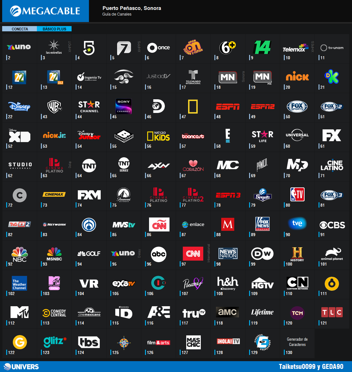 Megacable Puerto Peñasco, Sonora - 30 de Octubre de 2021 2 - Azteca Uno 3 - Las Estrellas 4 - Canal 5 5 - Azteca 7 6 - Once TV 7 - Once Niñas y Niños 8 - Multimedios Plus 9 - Canal Catorce 10 - Telemax 11 - TV UNAM 12 - Canal 22 13 - Canal 22.2 14 - Ingenio TV 15 - Canal del Congreso 16 - Justicia TV 17 - Telemundo Internacional 18 - Meganoticias Sonora 19 - Meganoticias MX 20 - Nick 21 - Discovery Kids 22 - Disney Channel 23 - Star Hits 24 - Star Fun 25 - Star Cinema 26 - Star Comedy 27 - Star Action 28 - Star Classics 29 - Star Series 35 - HBO 36 - HBO 2 37 - HBO Signature 38 - HBO Family 39 - HBO Plus 40 - HBO Mundi 41 - HBO Pop 42 - HBO Xtreme 43 - Warner TV 44 - Star Channel 45 - Sony 46 - Discovery 47 - National Geographic 48 - ESPN 49 - ESPN 2 50 - Fox Sports 51 - Fox Sports 2 52 - Disney XD 53 - Nick Jr. 54 - Disney Junior 55 - Cartoonito 56 - Nat Geo Kids 57 - Tooncast 58 - E! Entertainment 59 - Star Life 60 - Universal TV 61 - FX 62 - Studio Universal 63 - Cinema Platino Delay 64 - TNT 65 - TNT Series 66 - AXN 67 - Az Corazón 68 - Multicinema 69 - Panico 70 - Multi Premier 71 - Cine Latino 72 - Cinecanal 73 - Cinemax 74 - FXM 75 - Paramount Network 76 - Cinema Platino 77 - Cinema Platino 2 78 - ESPN 3 79 - Mega Sports 80 - NBA TV 81 - Fox Sports 3 82 - TVC Deportes 2 83 - NFL Network 84 - Tele Fórmula 85 - MVS TV 86 - CNN En Español 87 - Enlace TBN 88 - Milenio Televisión 89 - Fox News 90 - TVE Internacional 91 - CBS 92 - NBC 93 - MSNBC 94 - NBC Golf 95 - Azteca Uno Delay 96 - ABC 97 - CNN International 98 - News Nation 99 - DW 100 - History 101 - Animal Planet 102 - The Weather Channel 103 - MTV 00s 104 - VR 105 - Exa TV 106 - I.SAT 107 - Pasiones 108 - Discovery Home & Health 109 - HGTV 110 - Cartoon Network 111 - Space 112 - MTV 113 - Comedy Central 114 - Cine Mexicano 115 - Discovery ID 116 - A&E 117 - Tru TV 118 - AMC 119 - Lifetime 120 - TCM 121 - TLC 122 - El Gourmet 123 - Glitz* 124 - TBS 125 - María Visión 126 - Film & Arts 127 - MásChic 128 - ¡Hola! TV 129 - Latin American Sports 130 - Generador de Caracteres