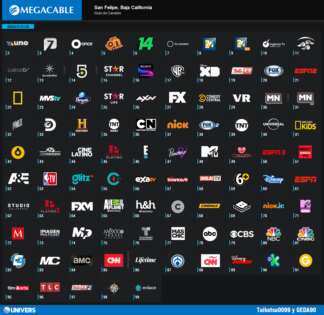 Megacable San Felipe, Baja California - 30 de Octubre de 2021 2 - Azteca Uno 3 - Azteca 7 4 - Once TV 5 - Once Niñas y Niños 6 - Canal Catorce 7 - TV UNAM 8 - Canal 22 9 - Canal 22.2 10 - Ingenio TV 11 - Canal del Congreso 12 - Justicia TV 13 - Las Estrellas Local 14 - Canal 5 Local 15 - Star Channel 16 - Sony 17 - Warner TV 18 - Disney XD 19 - TVC Deportes 20 - Fox Sports 21 - ESPN 2 22 - National Geographic 23 - MVS TV 24 - Mega Sports 25 - Star Life 26 - AXN 27 - FX 28 - Comedy Central 29 - VR 30 - Meganoticias Local 31 - Meganoticias MX 32 - Panico 33 - Discovery 34 - History 35 - TNT Series 36 - Cartoon Network 37 - Nick 38 - Fox Sports 2 39 - TNT 40 - Universal TV 41 - Nat Geo Kids 42 - Space 43 - Cine Mexicano 44 - Cine Latino 45 - Cinema Platino 46 - E! Entertainment 47 - Pasiones 48 - MTV 49 - Az Corazón 50 - ESPN 3 51 - Basket Americas TV 52 - A&E 53 - NBA TV 54 - Glitz* 55 - I.SAT 56 - Exa TV 57 - Tooncast 58 - ¡Hola! TV 59 - Multimedios Plus 60 - Disney Channel 61 - ESPN 62 - Studio Universal 63 - Cinema Platino 2 64 - FXM 65 - Animal Planet 66 - Discovery Home & Health 67 - Cinecanal 68 - Cinemax 69 - Cartoonito 70 - Nick Jr. 71 - MTV 00s 72 - Milenio Televisión 73 - Imagen Multicast 74 - Multi Premier 75 - México Travel Channel 76 - Telemundo Internacional 77 - MásChic 78 - ABC 79 - CBS 80 - NBC 81 - CNBC 82 - Latin American Sports 83 - Multicinema 84 - AMC 85 - CNN International 86 - Lifetime 87 - Tele Fórmula 88 - CNN En Español 89 - Disney Junior 90 - Discovery Kids 91 - El Gourmet 92 - Discovery Science 93 - A3 Series 94 - PX Sports 95 - Film & Arts 96 - TLC 97 - TVC Deportes 98 - María Visión 99 - Enlace TBN