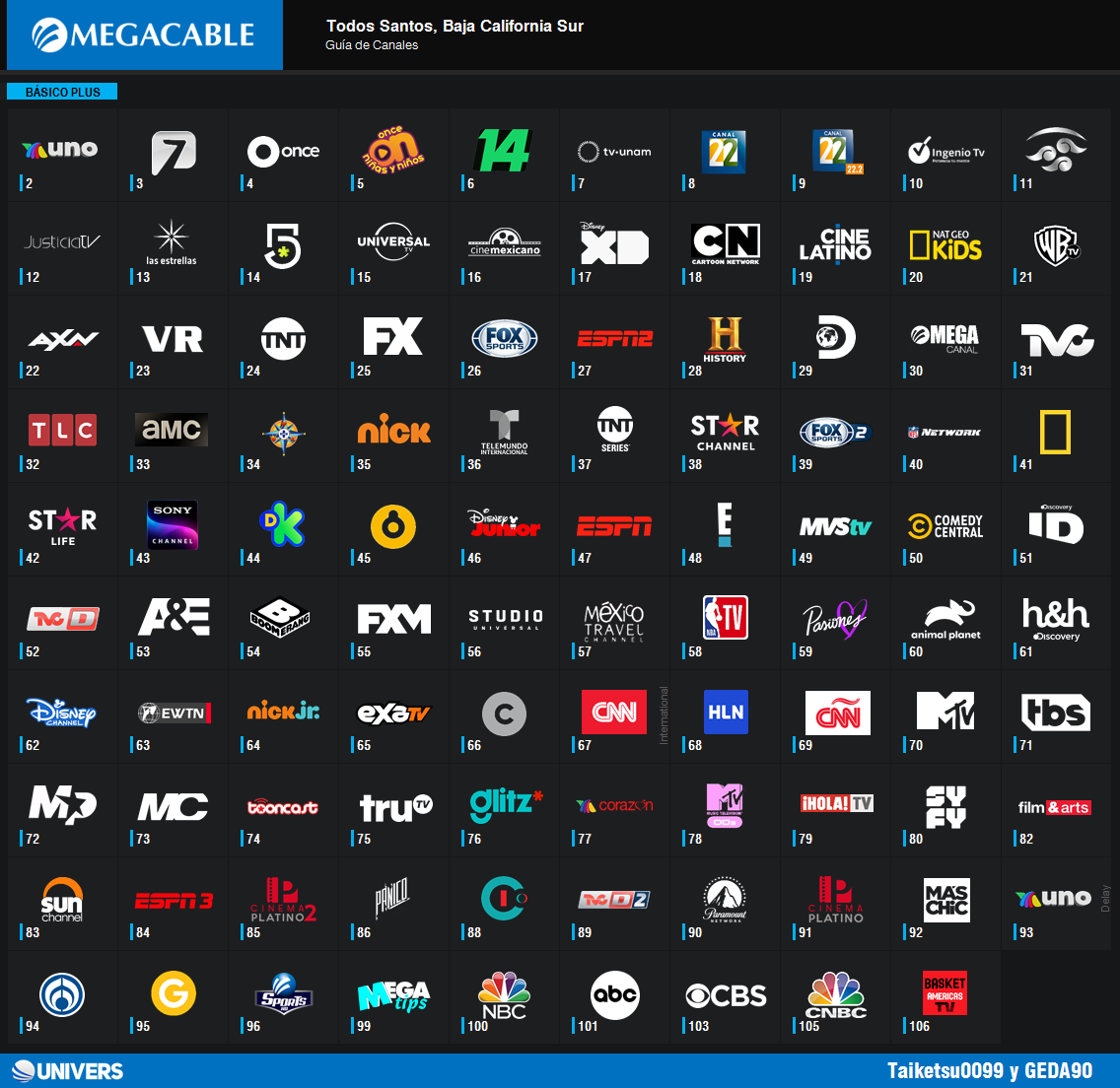 Megacable Todos Santos, Baja California Sur - 2 de Septiembre de 2021 2 - Azteca Uno 3 - Azteca 7 4 - Once TV 5 - Once Niñas y Niños 6 - Canal Catorce 7 - TV UNAM 8 - Canal 22 9 - Canal 22.2 10 - Ingenio TV 11 - Canal del Congreso 12 - Justicia TV 13 - Las Estrellas 14 - Canal 5 15 - Universal TV 16 - Cine Mexicano 17 - Disney XD 18 - Cartoon Network 19 - Cine Latino 20 - Nat Geo Kids 21 - Warner TV 22 - AXN 23 - VR 24 - TNT 25 - FX 26 - Fox Sports 27 - ESPN 2 28 - History 29 - Discovery 30 - Meganoticias 31 - Meganoticias MX 32 - TLC 33 - AMC 34 - María Visión 35 - Nick 36 - Telemundo Internacional 37 - TNT Series 38 - Star Channel 39 - Fox Sports 2 40 - NFL Network 41 - National Geographic 42 - Star Life 43 - Sony 44 - Discovery Kids 45 - Space 46 - Disney Junior 47 - ESPN 48 - E! Entertainment 49 - MVS TV 50 - Comedy Central 51 - Discovery ID 52 - TVC Deportes 53 - A&E 54 - Cartoonito 55 - FXM 56 - Studio Universal 57 - México Travel Channel 58 - NBA TV 59 - Pasiones 60 - Animal Planet 61 - Discovery Home & Health 62 - Disney Channel 63 - EWTN 64 - Nick Jr. 65 - Exa TV 66 - Cinecanal 67 - CNN International 68 - HLN 69 - CNN En Español 70 - MTV 71 - TBS 72 - Multi Premier 73 - Multicinema 74 - Tooncast 75 - Tru TV 76 - Glitz* 77 - Az Corazón 78 - MTV 00s 79 - ¡Hola! TV 80 - Syfy 81 - Az Cinema 82 - Film & Arts 83 - Sun Channel 84 - ESPN 3 85 - Cinema Platino 2 86 - Panico 87 - TV CORTOS 88 - I.SAT 89 - TVC Deportes 2 90 - Paramount Network 91 - Cinema Platino 92 - MásChic 93 - Azteca Uno Delay 94 - Tele Fórmula 95 - El Gourmet 96 - Mega Sports 97 - PX Sports 98 - Trace Sports 99 - Mega Tips 100 - NBC 101 - ABC 102 - BBC World News 103 - CBS 104 - TV5 Monde 105 - CNBC 106 - Basket Americas TV