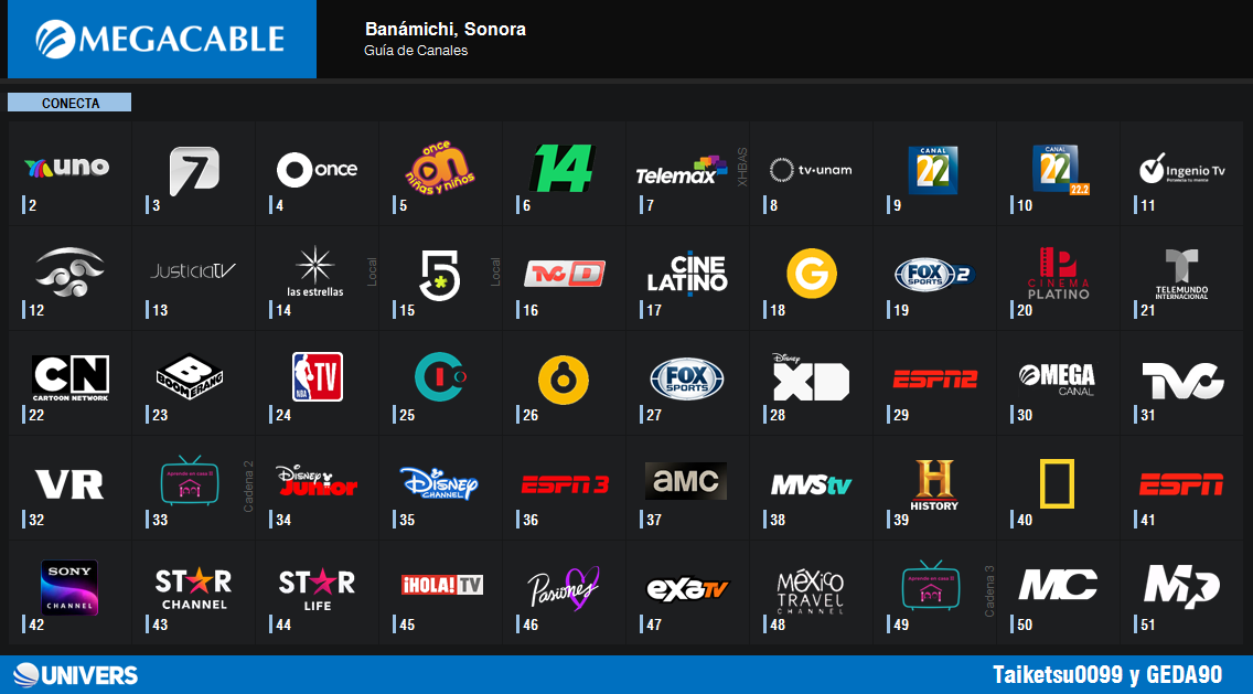 June 24, 20241 yr Author hace 1 hora, Alejandro Domínguez dijo: Megacable Banámichi, Sonora 2. Azteca Uno 3. Azteca 7 4. Once TV 5. Once Niños 6. Canal Catorce 7. Telemax 8. TV UNAM 9. Canal 22 10. Canal 22.2 11. Ingenio TV 12. Canal del Congreso 13. Justicia TV 14. Las Estrellas Local 15. Canal 5 Local 16. TVC Deportes 17. Cine Latino 18. El Gourmet 19. Fox Sports 2 20. Cinema Platino 21. Telemundo Internacional 22. Cartoon Network 23. Cartoonito 24. NBA TV 25. I.SAT 26. Space 27. Fox Sports 28. Disney XD 29. ESPN 2 30. Mega Noticias 31. Mega Noticias MX 32. VR 33. Mega Sports 34. Disney Junior 35. Disney Channel 36. ESPN 3 37. AMC 38. MVS TV 39. History 40. National Geographic 41. ESPN 42. Sony 43. Star Channel 44. Star Life 45. Hola TV 46. Pasiones 47. Exa TV 48. México Travel Channel 49. TVC Deportes 2 50. Multicinema 51. Multi Premier